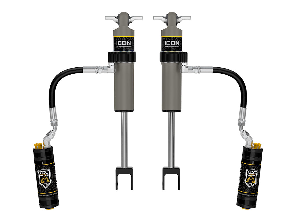 ICON Vehicle Specific (V.S.) 2.5 Aluminum Series shocks are designed and built to give your vehicle outstanding performance off-road and a smooth ride on the street. These shocks are configured specifically for each application in both length and damping tune. Like all ICON shock absorbers, V.S. 2.5 Aluminum Series shocks are 100% rebuildable and 100% revalveable. For piggyback and specific remote reservoir applications, ICON’s unique use of a 6061 billet aluminum manifold a few inches below the top cap of the shock creates an internal “Bump Zone” that, when used, creates an additional 20% of damping force. This additional force helps prevent harsh bottom outs and controls the suspension when compressing at high velocity. ICON's exclusive Compression Damping Control Valves are included for precisely dialing in your suspension performance. CDCV controls fluid flow under compression, allowing you to achieve the perfect tune whether driving on the street, slow-crawling through the rocks or mobbing across the desert at full throttle.