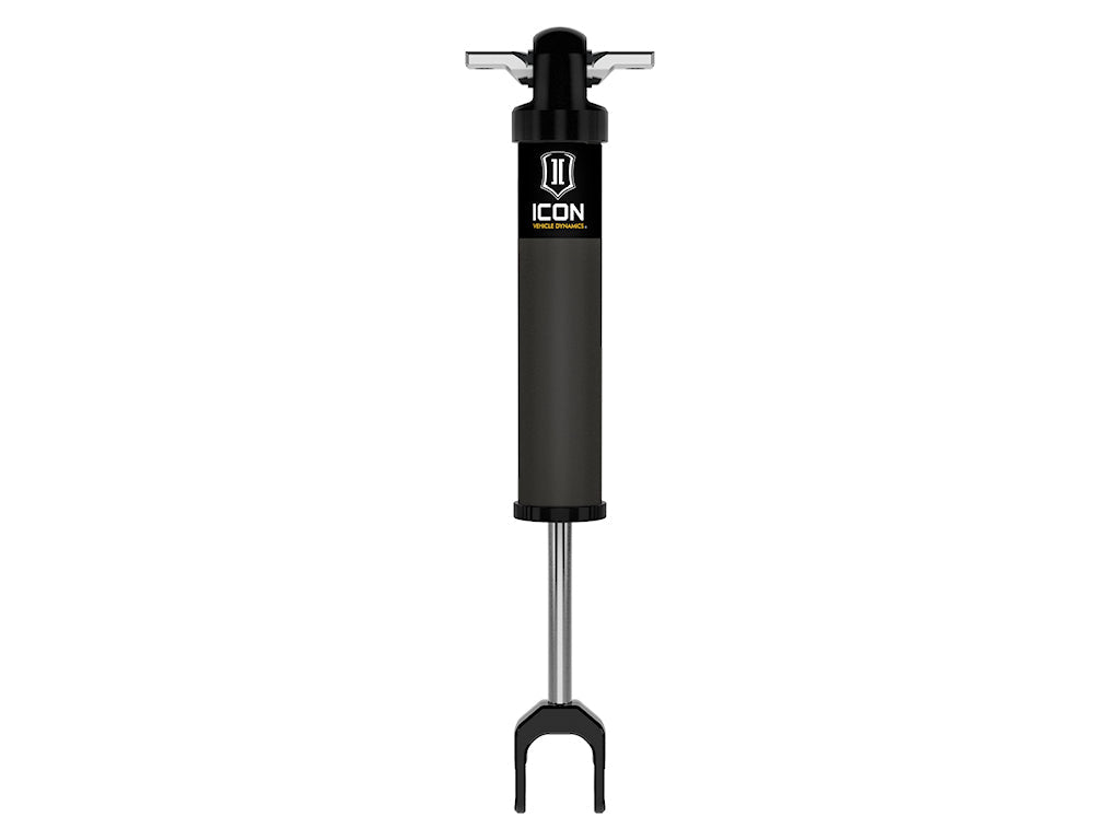 ICON Vehicle Specific (V.S.) 2.0 HD Series shock absorbers are the ultimate in cost-effective upgrades, specifically tailored by ICON engineers for heavy-duty applications. The V.S. 2.0 HD Series shocks are a high-quality upgrade for the everyday street driver and weekend warrior looking for improved on and off-road ride quality and performance. ICON 2.0 HD shocks feature hard-anodized 6061 aluminum cylinders with increased wall thickness and taller DU bearings, significantly improving pull apart and side load strength compared to ICON 2.0 Aluminum Series shock absorbers. Press in, bonded rubber upper bushing/bar pin assembly provides factory like fitment and ease of install while also isolating road vibration. Forged aluminum lower mounting clevis maintains factory-like fitment and ensures maximum strength. Internal nitrogen reservoirs help provide consistent performance under hard use. Like all ICON shock absorbers, V.S. 2.0 HD Series shocks are 100% rebuildable and 100% revalveable. For those using their vehicle in extreme off road situations, consider the ICON V.S. 2.5 Aluminum Series shocks to handle extra abuse and punishment your suspension will need to endure.